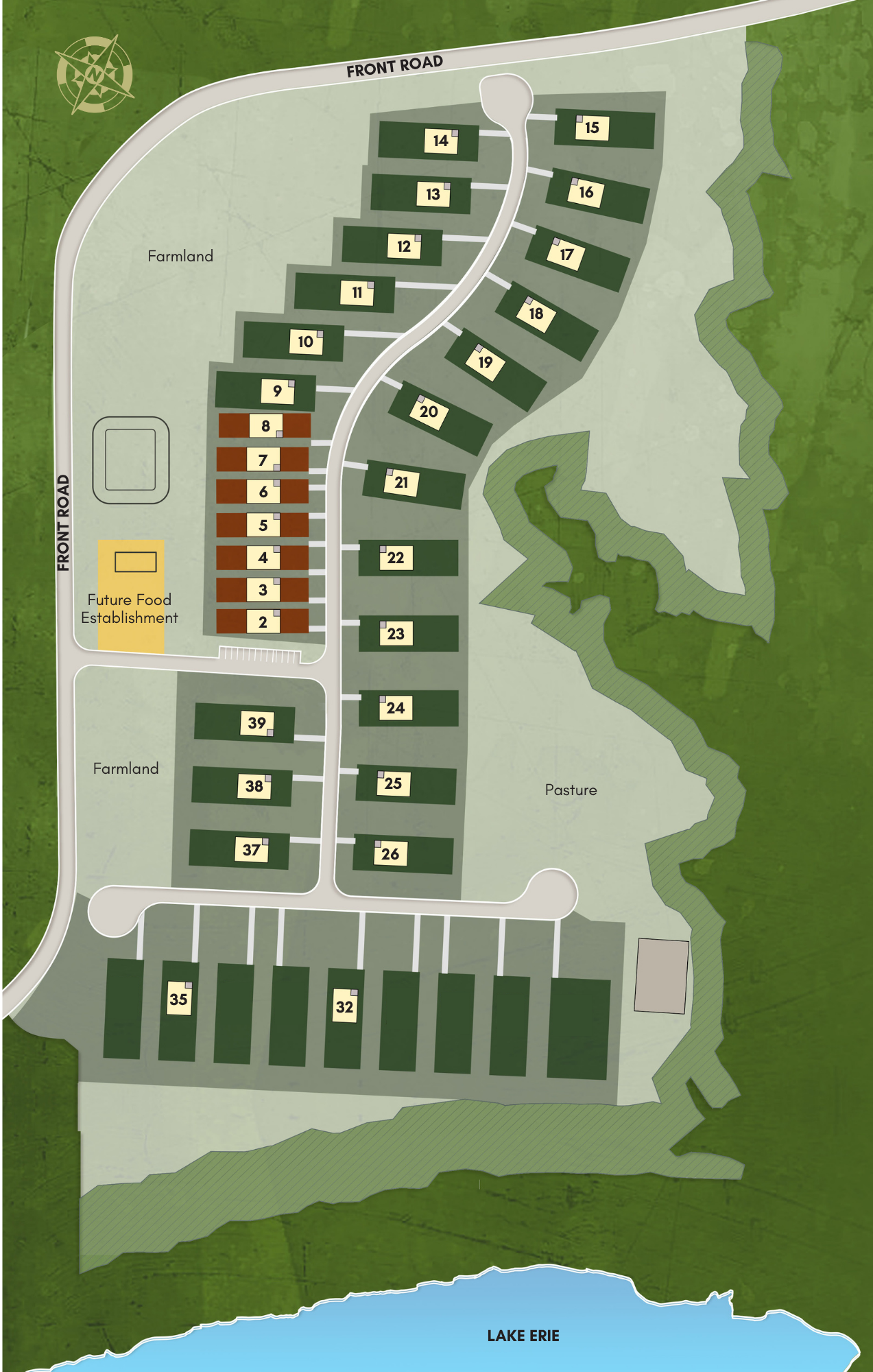 There is a view of Lake Erie, and several lots situated on the lake, however there is not lake access on-site. Closeby (within 10km) are many access points, including: Collin's Marina, Turkey Point Beach and Long Point Beach.